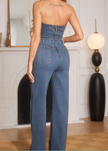 Strapless Rhinestone Embellished Denim Jumpsuit (Medium Dark Blue)
