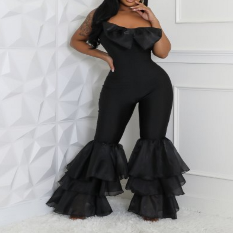 Non-stretch jumpsuit - Halter under boob wire - corset rhinestone - detachable arm sleeves - open back - zipper closure - wide-leg Inseam is 32 inches - 100% Polyester - hand wash cold