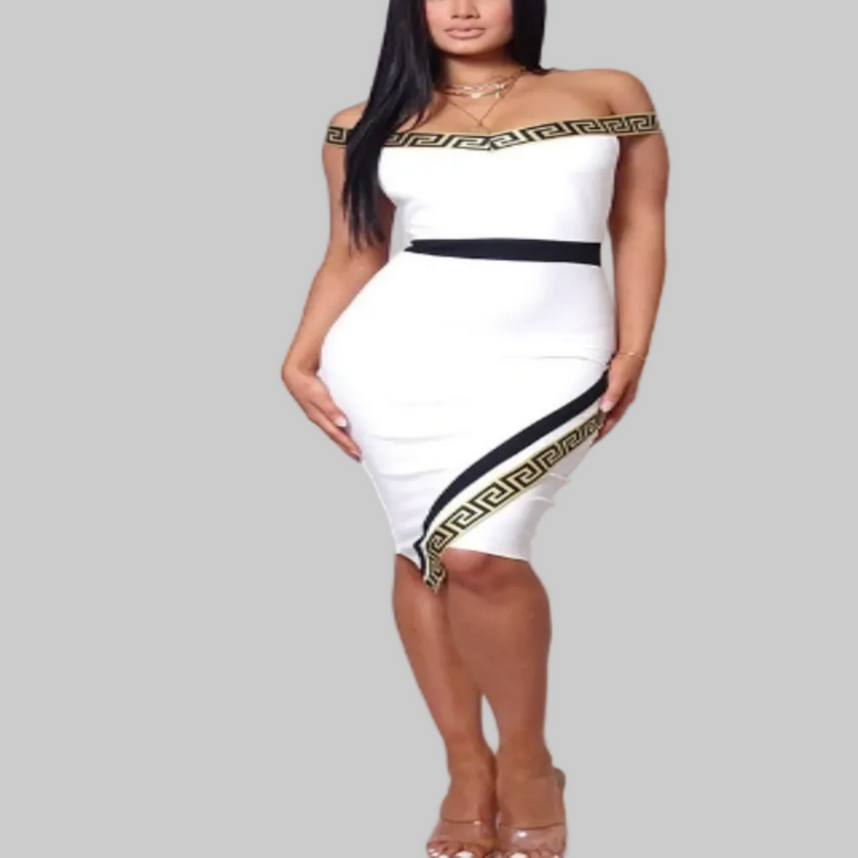 Collection « Géométrique Luxe » - Robe midi à bordure géométrique dorée