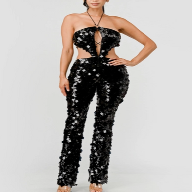 The Little Black Jumpsuit - Halter Large Sequins Keyhole Cut-Out Jumpsuit